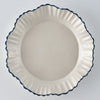 水谷さんの作品といえば、このあたたかみを感じる優しい「白」。光の角度によって変わる豊かな表情を愉しめます。またアンティークを思わせる美しいフォルム。まるで布のような柔らかさを感じられるリズム感のあるうつわです。フチの呉須の青がアクセントになり可愛いフリルをより際立たせています。いつもの風景がちょっと特別になるような、凛とした美しさを纏ううつわ。また、料理が主役になるように、料理する人が愉しめるように、使い手を想い作られています。見た目の美しさもさながら、使い心地も兼ね備えたうつわです。※こちらはツヤのある「白」です。
